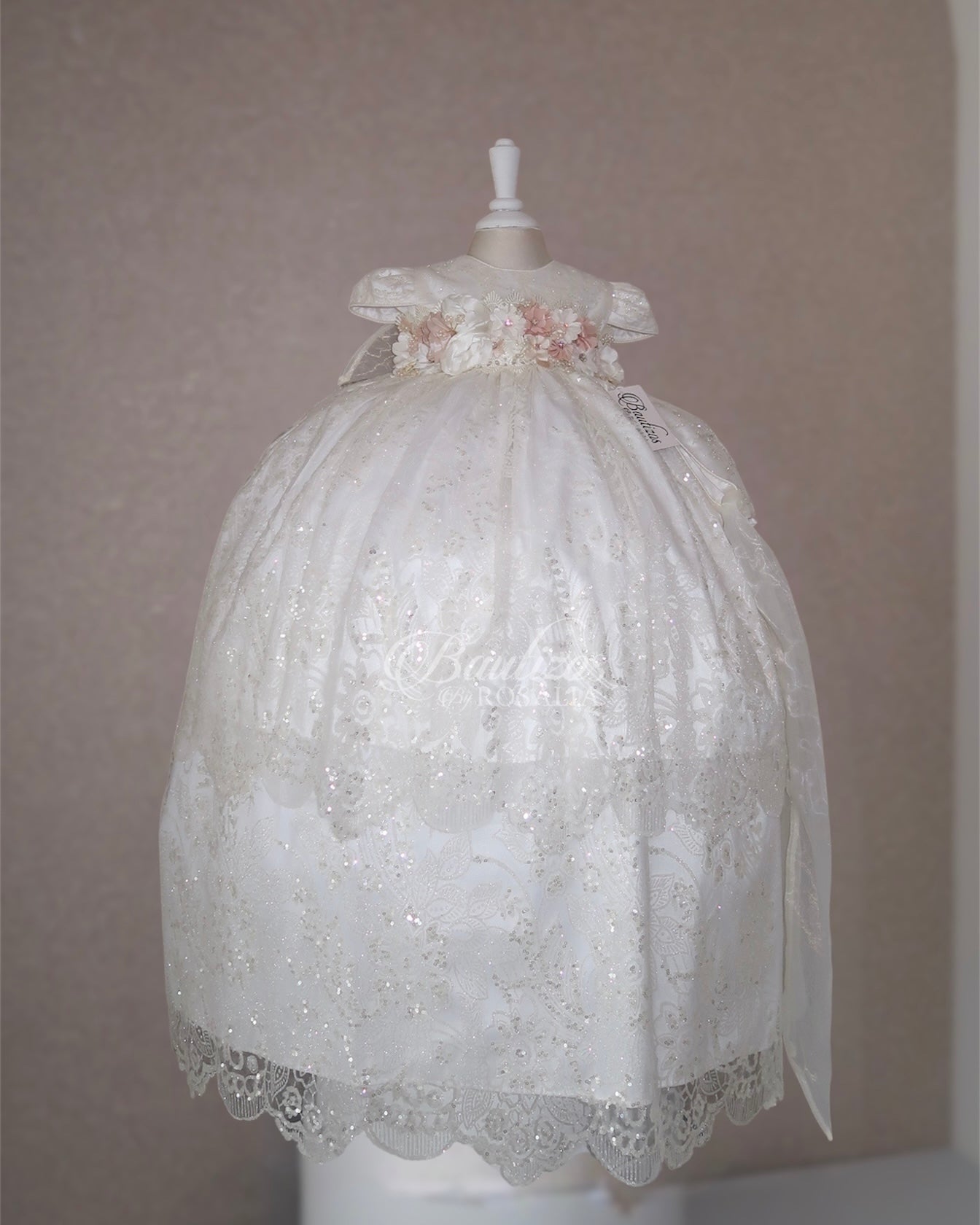Ropon de niña desmontable,con muchos Dentalles de chaquira ,con flores en el centro