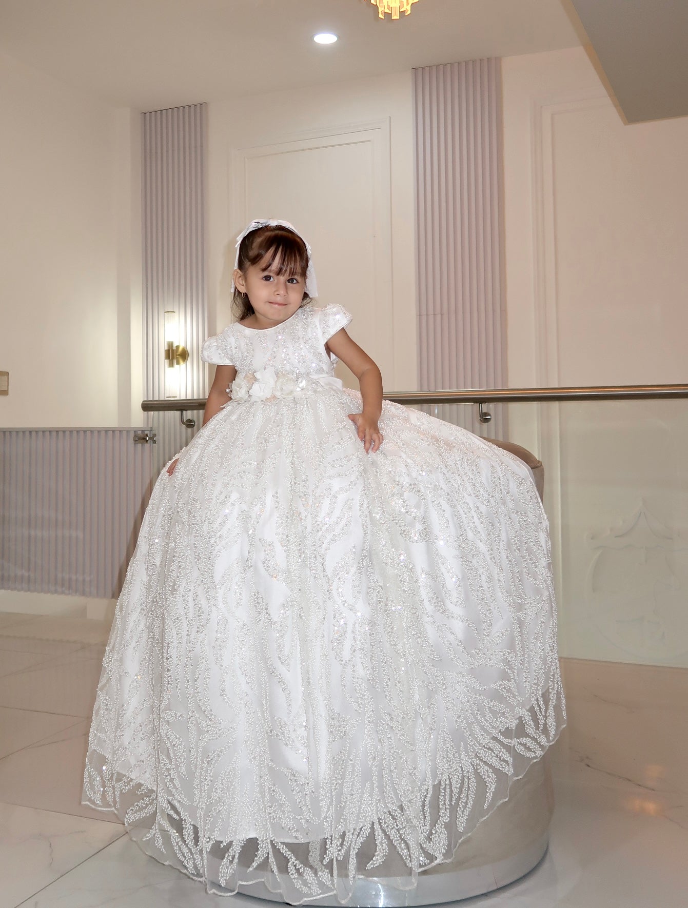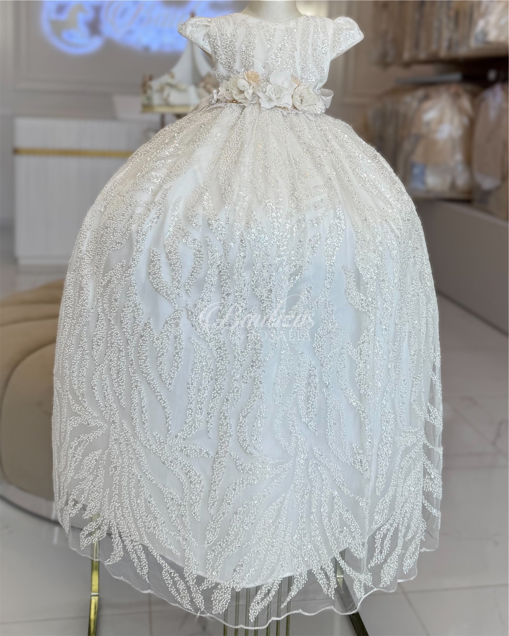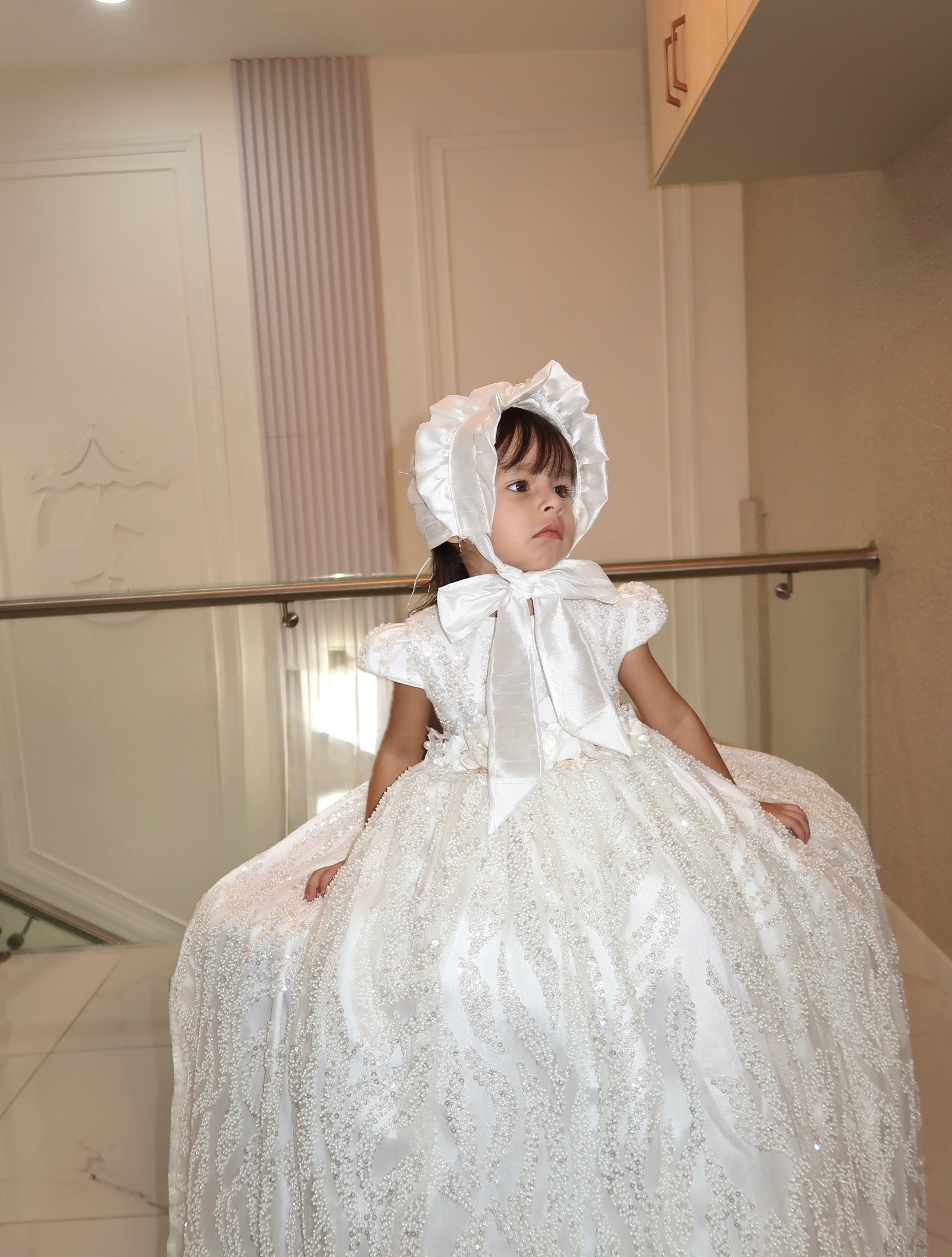 Ropon niña BBRN28 desmontable,bordado con chaquiron blanco y lentejuela, incluye gorro.